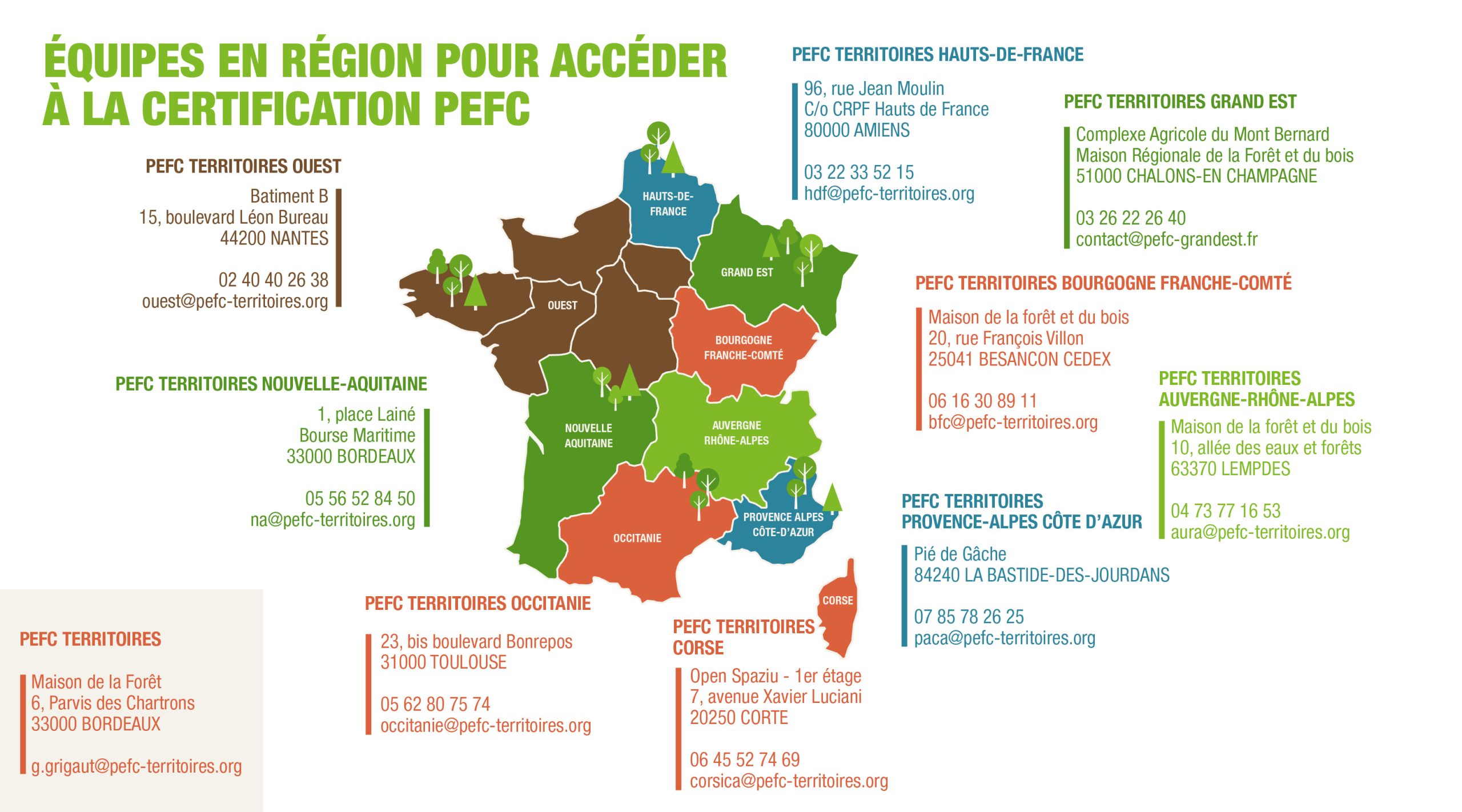 L’organisation territoriale de l’accès à la certification de gestion forestière durable PEFC en France métropolitaine, pour les forestiers privés comme publics, s’articule autour de deux entités distinctes et complémentaires : PEFC Territoires et le Groupe Coopération Forestière (GCF).